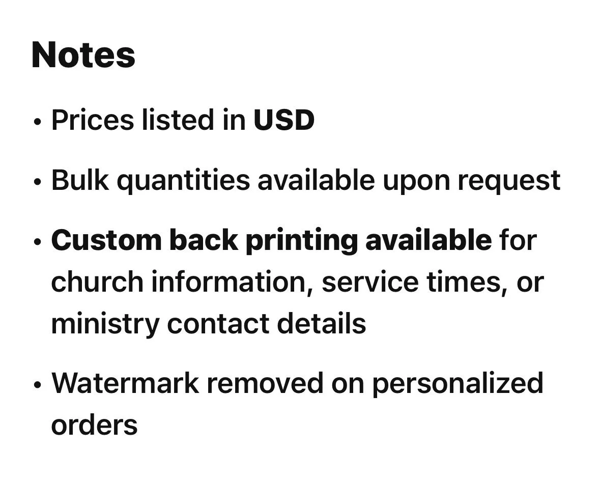 We can personalize the back of the card with your church or organization’s information and service times. This helps people know where they can visit and learn more.